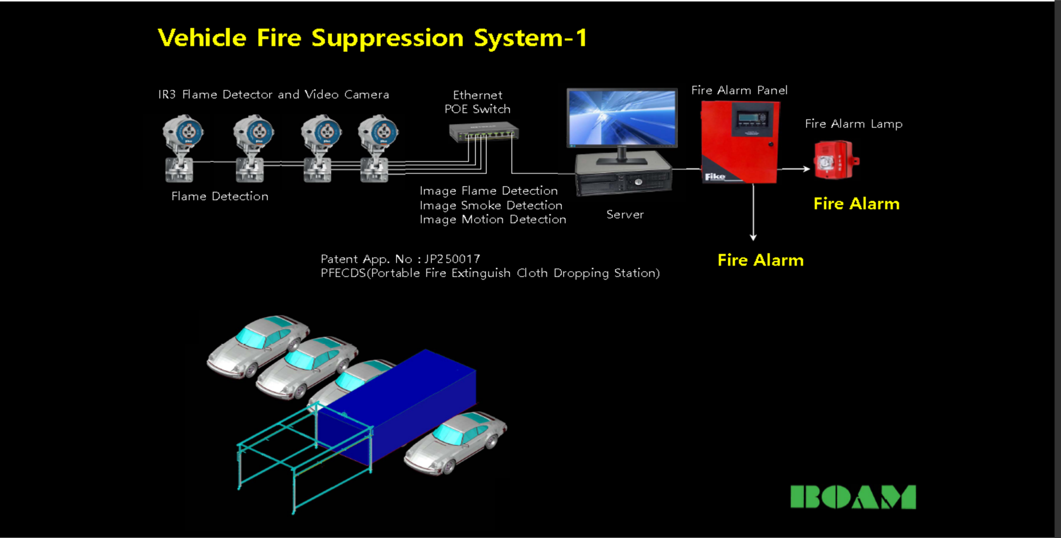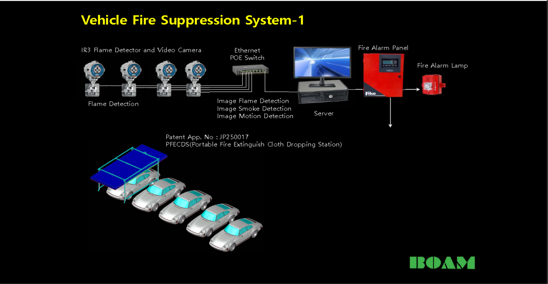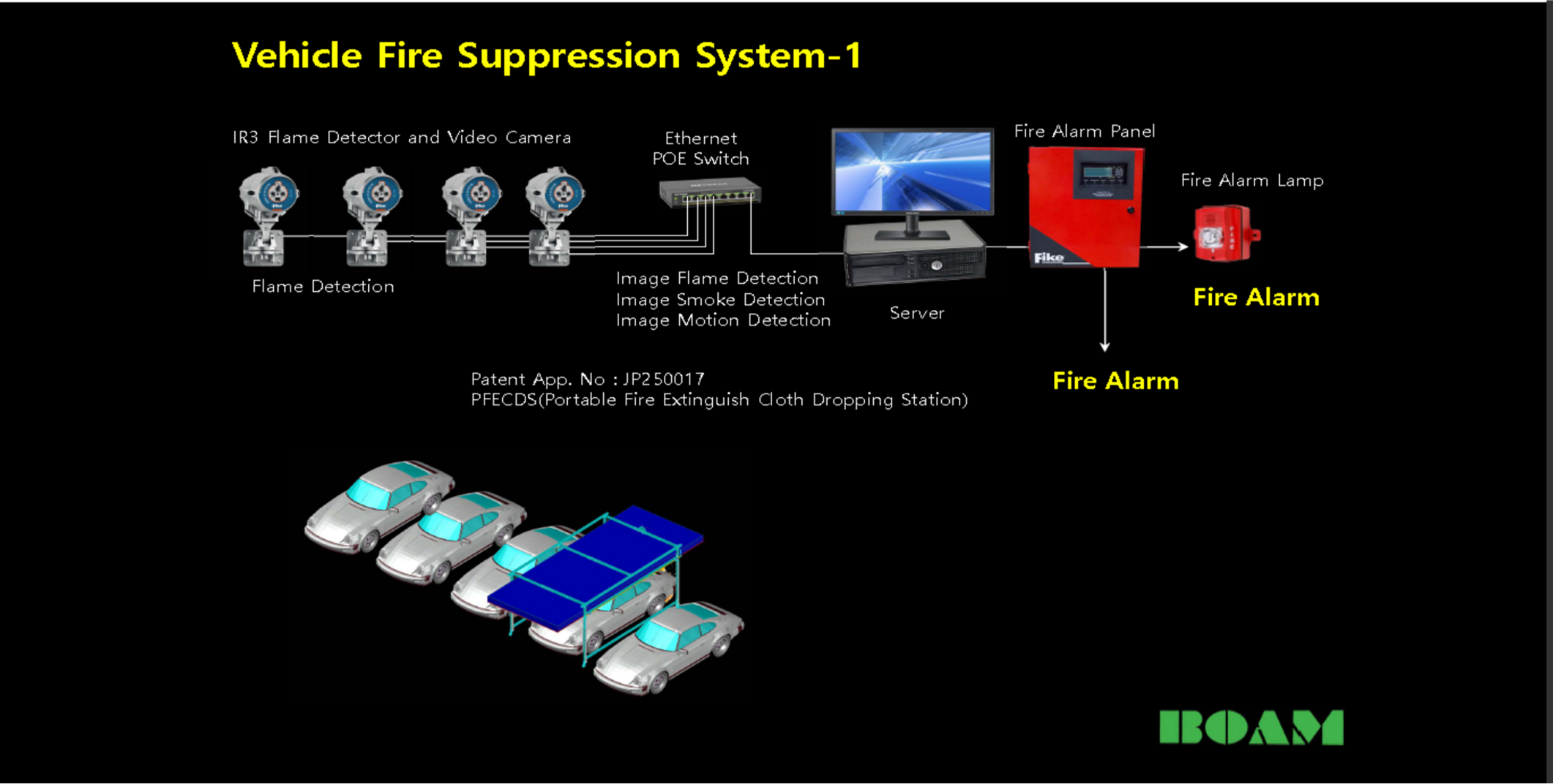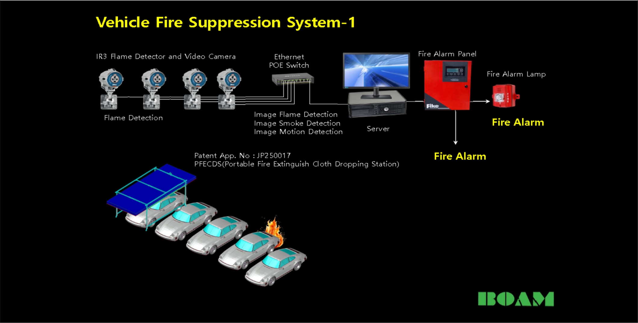 지하 공간에서 차량화재를 초기에 열 및 화염을 감지, 대응하여 화재확산을 방지 및 진압하여 소중한 재산 및 인명피해를 막는다.